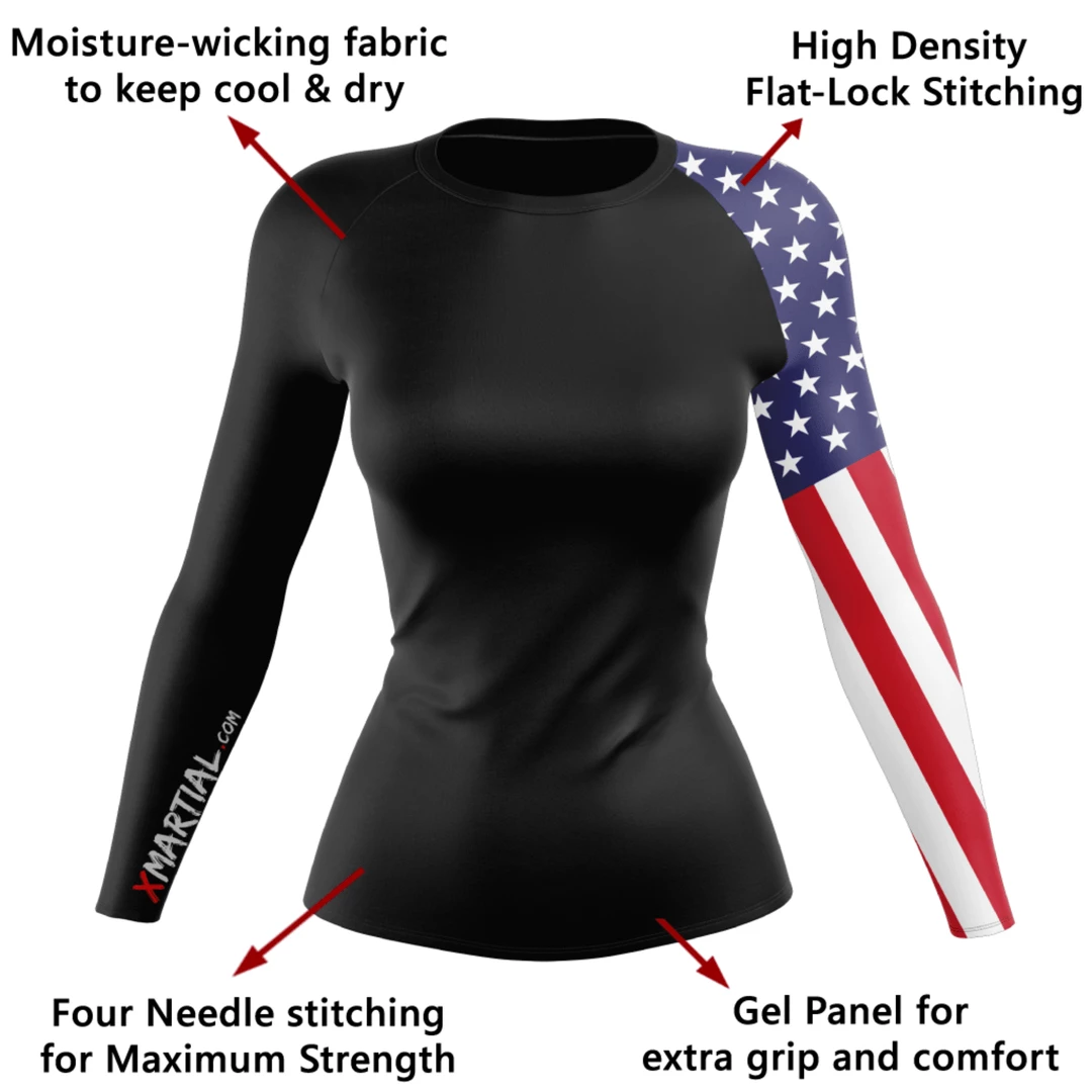The American Warrior Women’s Rash Guard empowers every woman to be a warrior. This compression shirt is built particularly for strenuous training and competition, with colors that will never fade, and will not lose their shape or fits. Long sleeves and short sleeves are available. It’s not only about jiu-jitsu! Great for MMA and BJJ rash guards, surfing, watersports, and as a women’s exercise compression shirt.