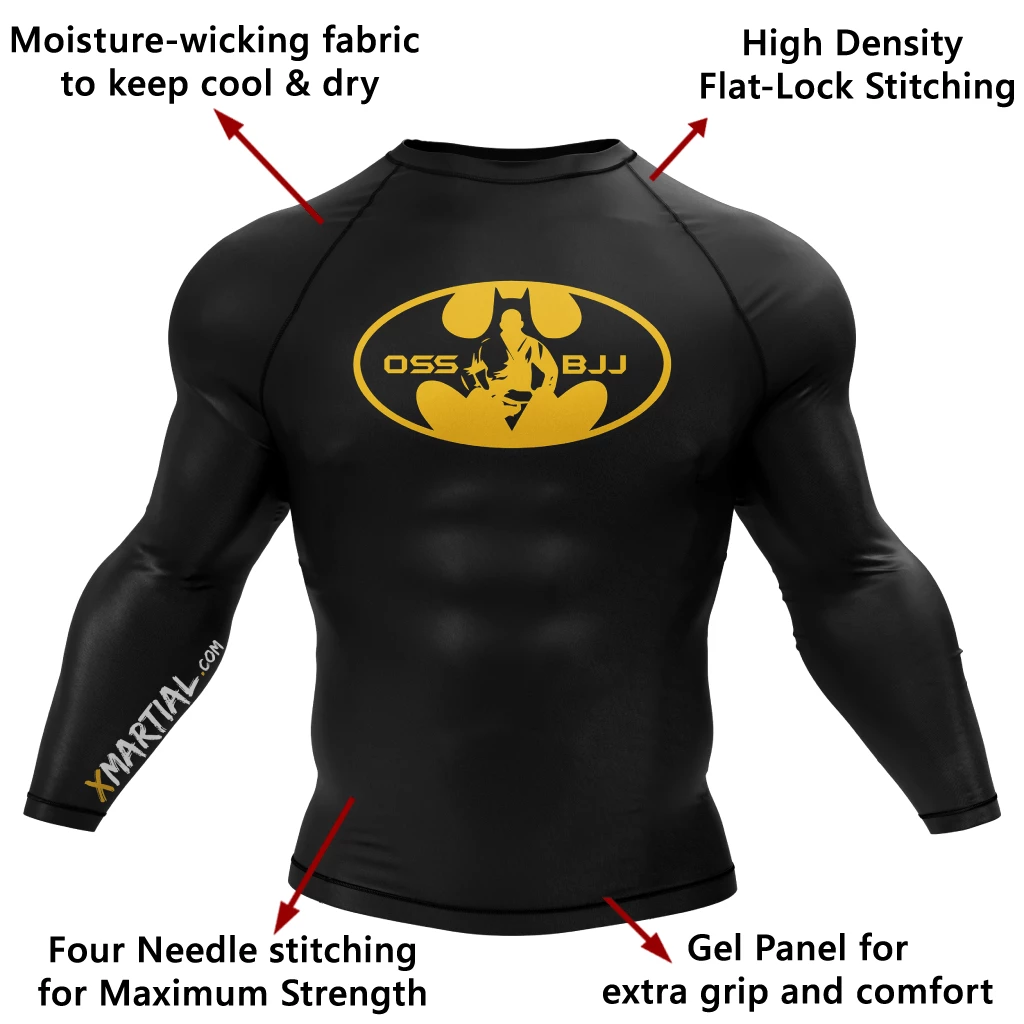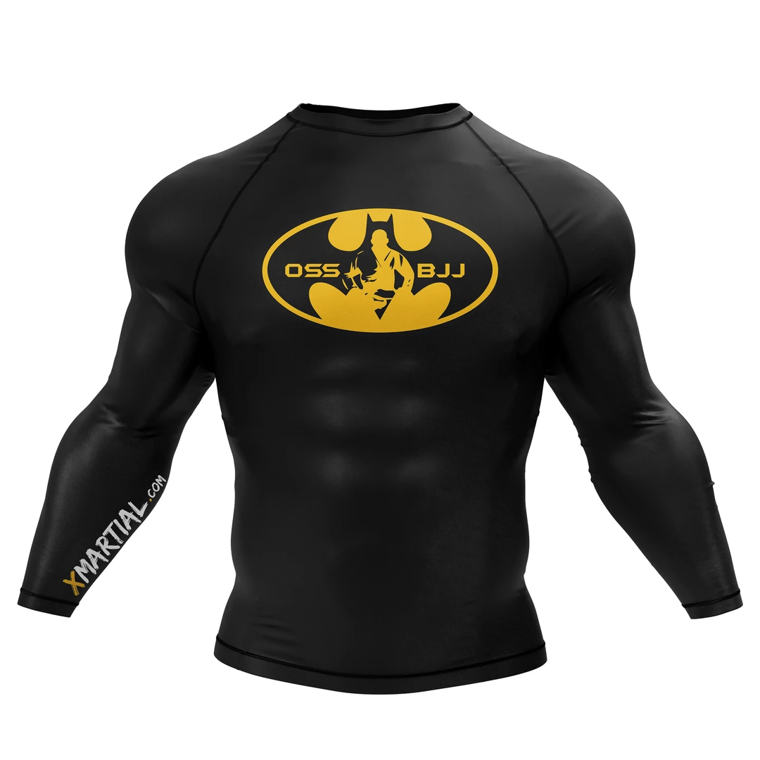 In the Bat-Jitsu BJJ Rash Guard, you can train like a vigilante. This long sleeve compression shirt is designed to withstand any workout movement and is perfect not just for jiu-jitsu but also for MMA and BJJ, for surfing, watersports, and a workout.