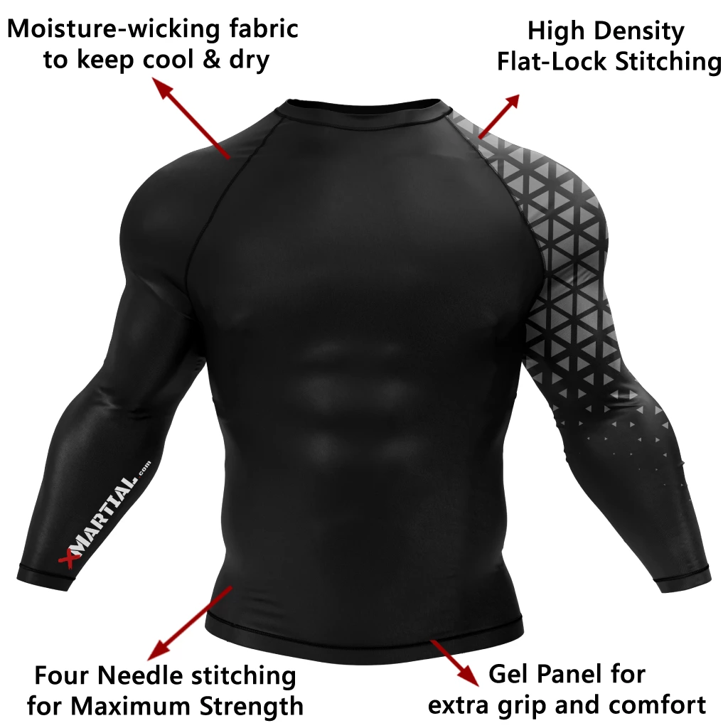 The Grappler Fightwear Bundle is inspired by the classic one-sleeve design popular among grapplers. Made of high-quality material, this compression shirt is designed for high-performance training and competition. Available in longsleeves grey geometric. Not just for jiu-jitsu! Great as an MMA and BJJ, for surfing, watersports, and men’s training.