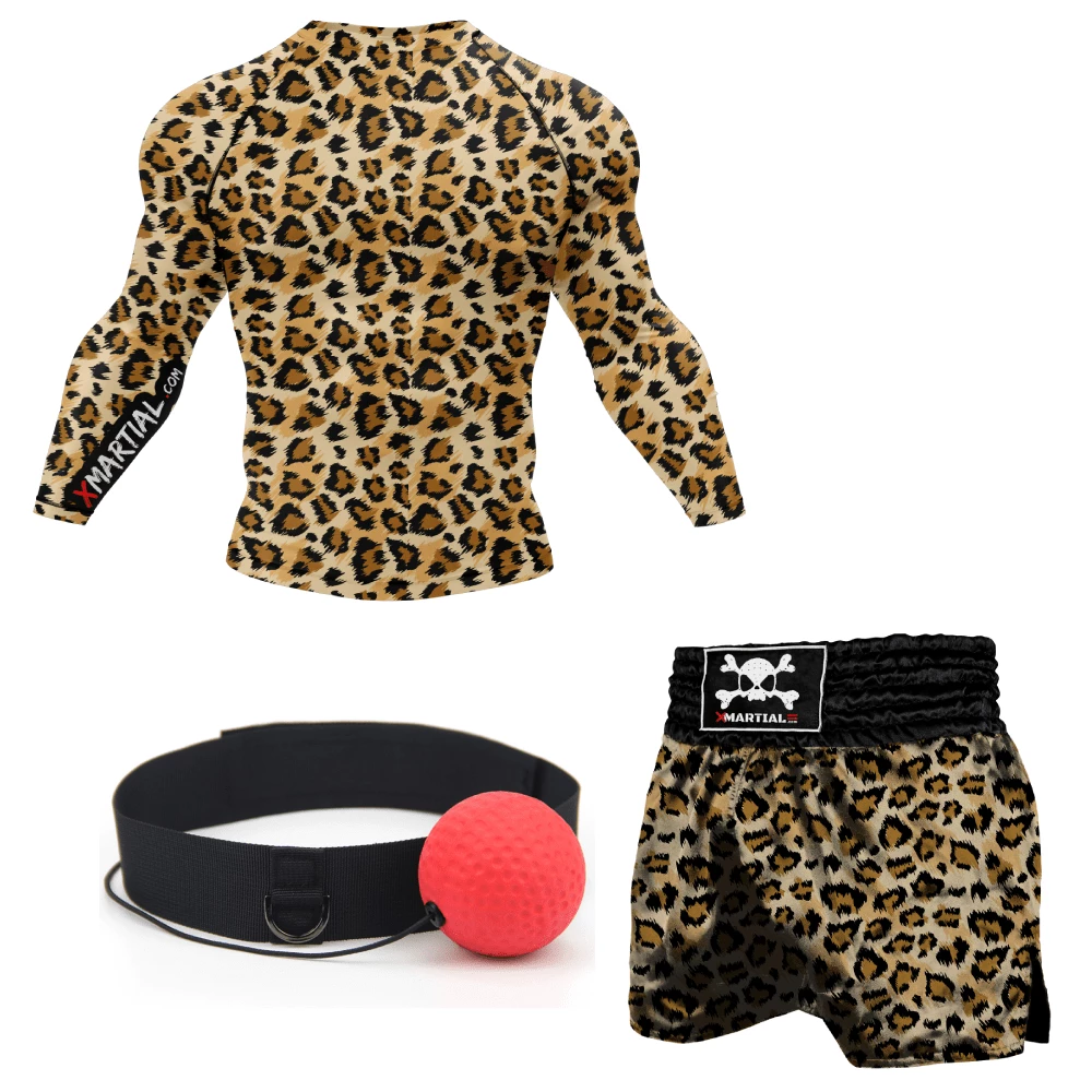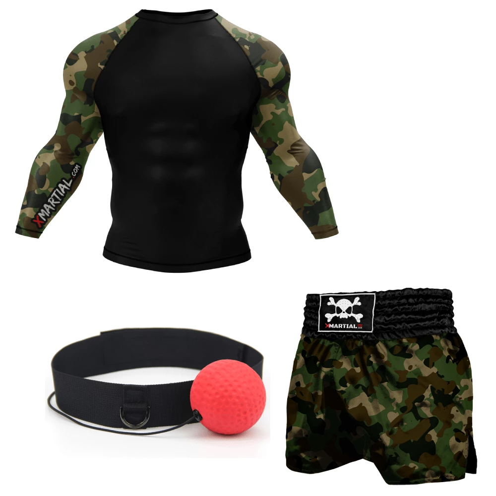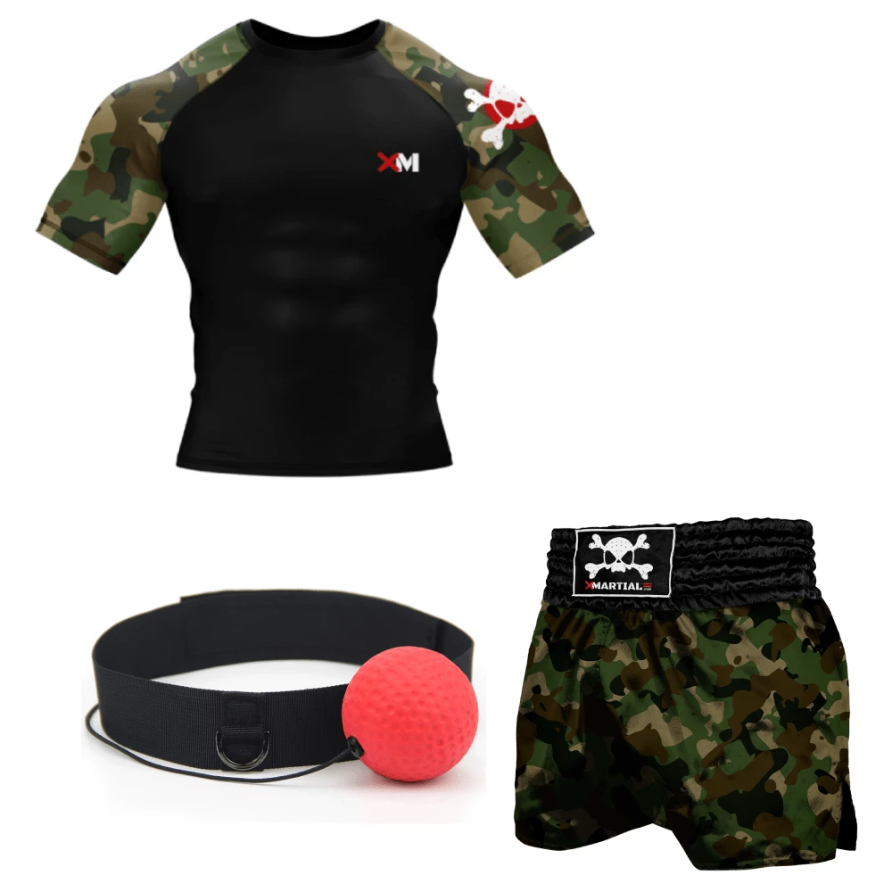 Take your Muay Thai to the next level with the Muay Thai Training bundle with Reflex Ball. This bundle includes premium products at affordable prices. You may pick a design from an assortment of our most popular Muay Thai rash guard and Muay Thai Shorts Pairs. We also included a reflex ball so you can improve your timing and defense any time you want. Our rash guards and Muay Thai shorts are all made of premium quality and ready to be used for your next training sessions. Best used for Muay Thai, but can be used for MMA, kickboxing, BJJ, and general training.