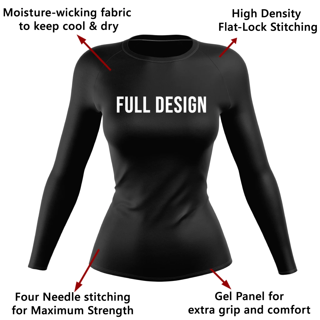 Our Custom BJJ Rash Guard is a staple for any rash guard collection. The sleek black design is suited for any belt rank or team, with or without the gi, MMA, or nogi. Whatever the training, black is always in. Fully sublimated custom bjj rash guard.