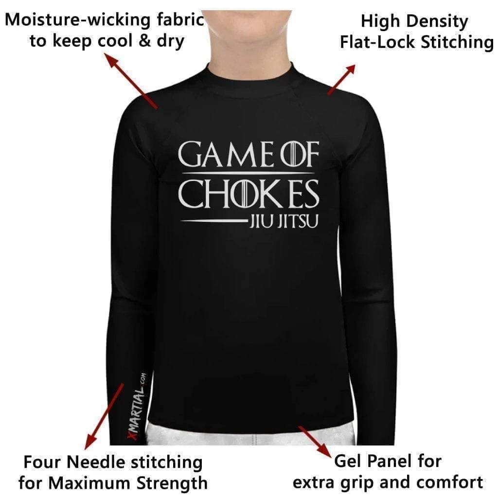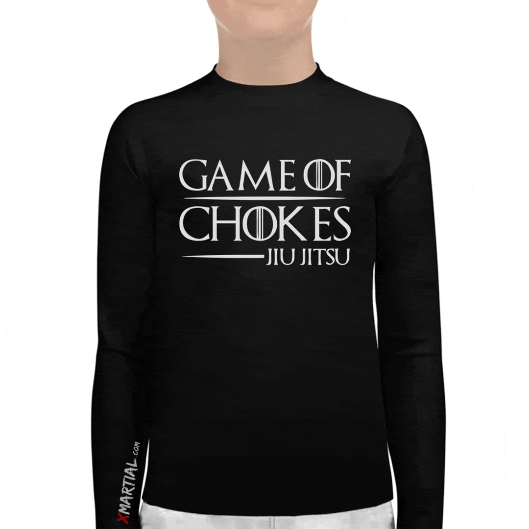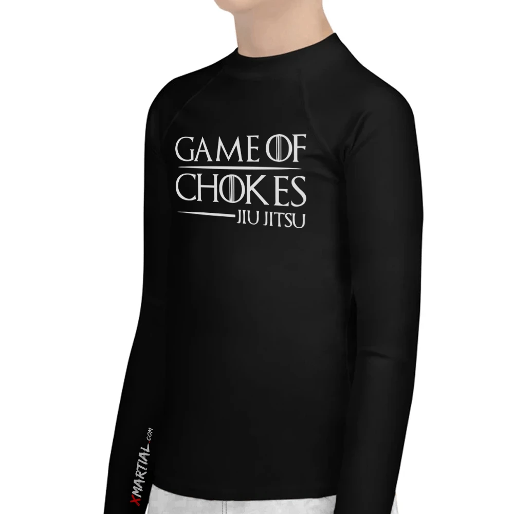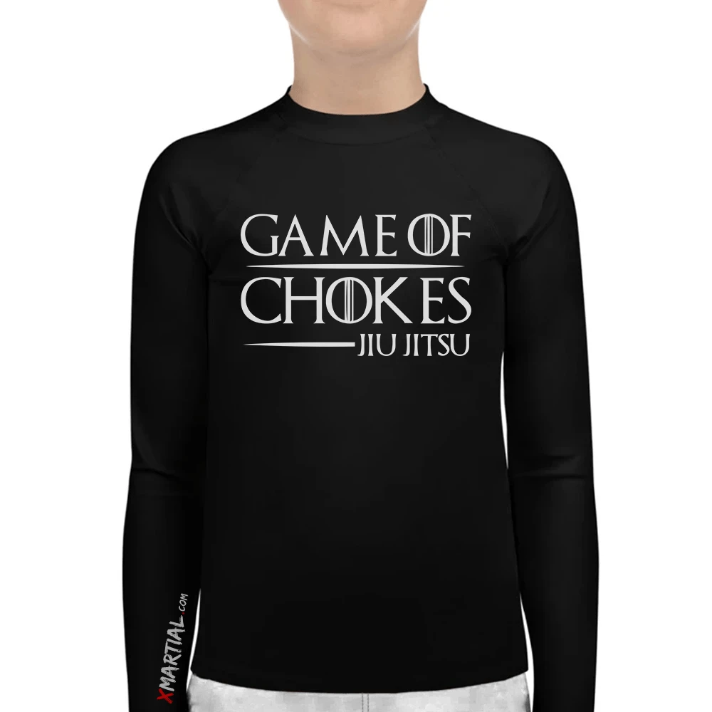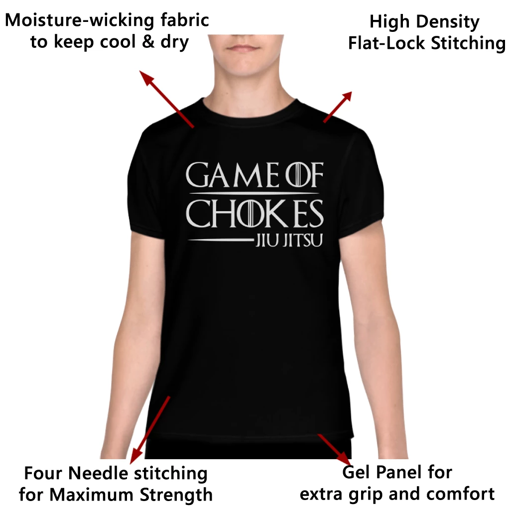 You can claim your crown with the Game of Chokes Kids BJJ Rash Guard! This compression shirt, complete with a signature jiu-jitsu catch, is designed to withstand any battle. Both long and short sleeves are available. Excellent for MMA and BJJ rash guards, surfing, watersports, and kids’ workout compression shirts.