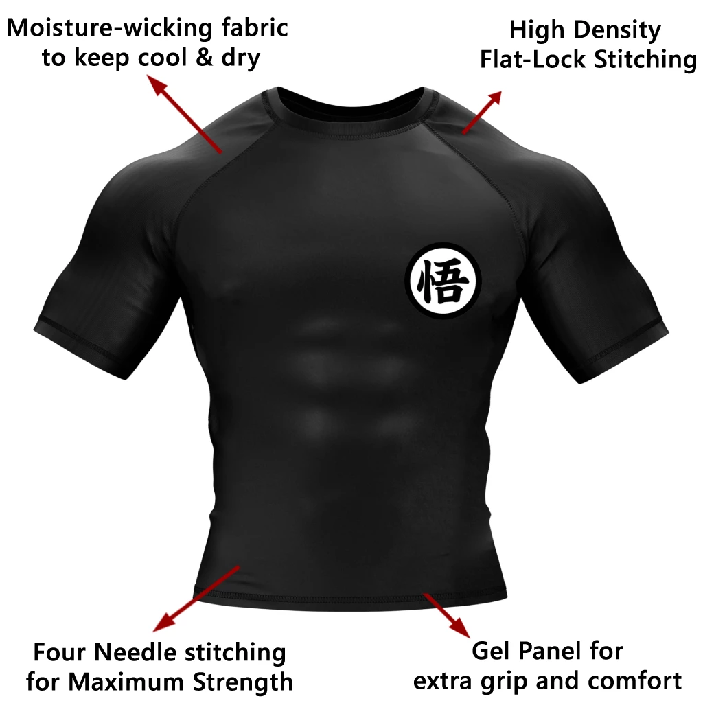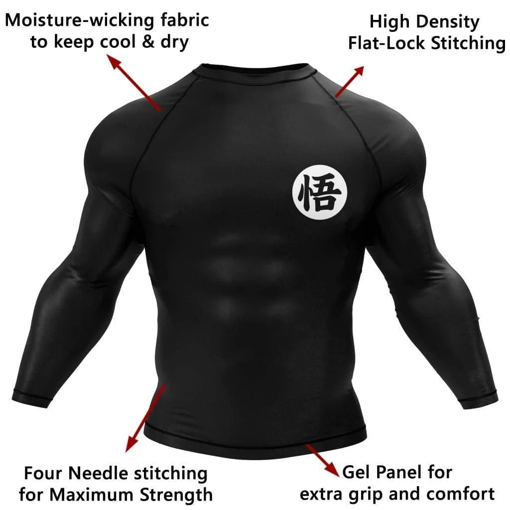 Channel your favorite Dragon Ball Z character with the Goku Black Rash Guard. Feel your power level increase every time you train in this lightweight compression shirt. Designed to withstand even the most rigorous workout. Available in long sleeve and short sleeve traditional orange and blackout. Not just for jiu-jitsu. Great as an MMA and BJJ rash guard, for surfing, watersports, and as a workout compression shirt for men.