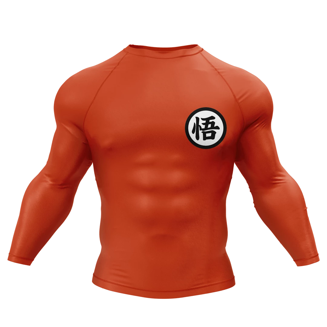 Channel your favorite Dragon Ball Z character with the Goku Orange Rash Guard. Feel your power level increase every time you train in this lightweight compression shirt. Designed to withstand even the most rigorous workout. Available in long sleeve and short sleeve traditional orange and blackout. Not just for jiu-jitsu. Great as an MMA and BJJ rash guard, for surfing, watersports, and as a workout compression shirt for men.