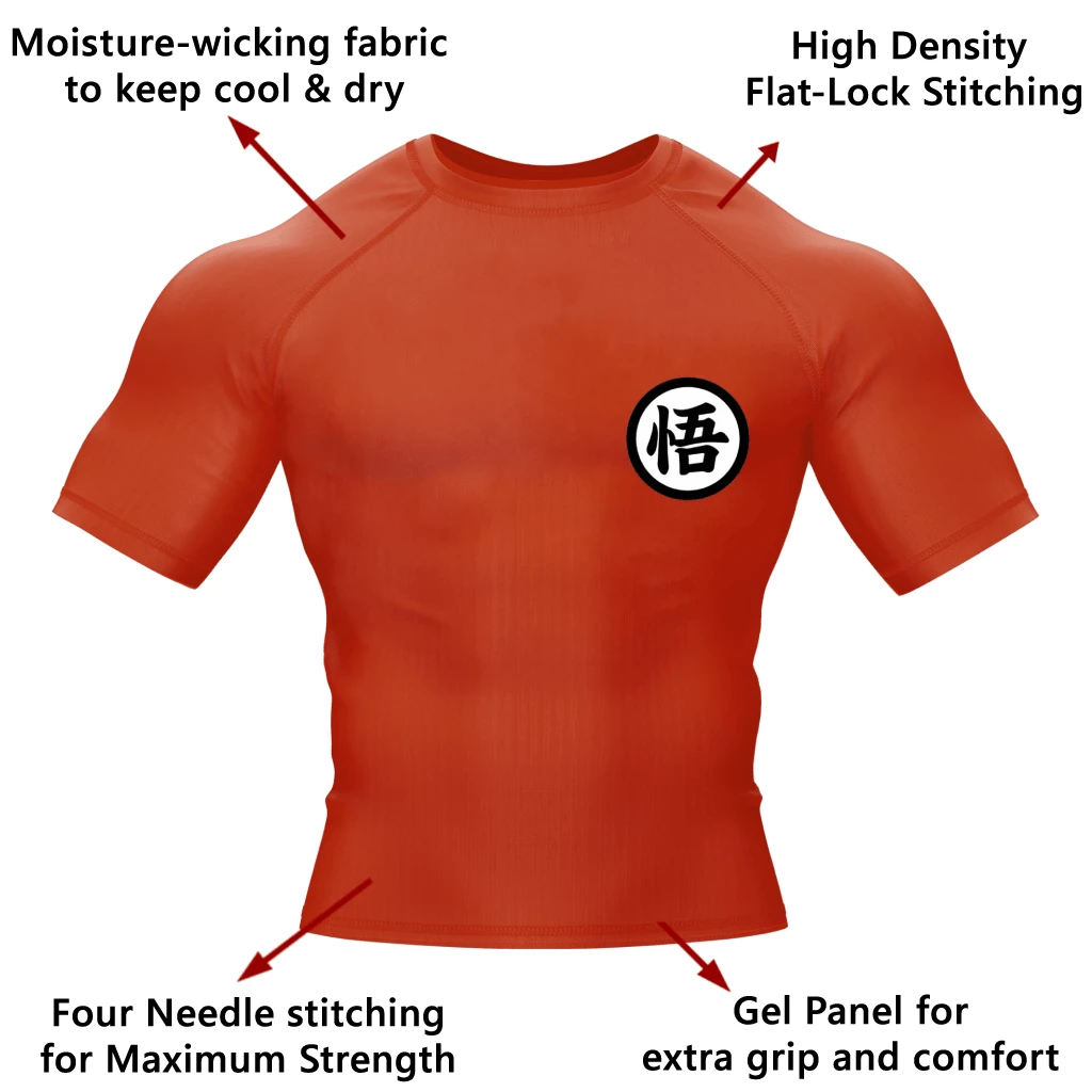 Channel your favorite Dragon Ball Z character with the Goku Orange Shortsleeve Rash Guard. Feel your power level increase every time you train in this lightweight compression shirt. Designed to withstand even the most rigorous workout. Available in long sleeve and short sleeve traditional orange and blackout. Not just for jiu-jitsu. Great as an MMA and BJJ rash guard, for surfing, watersports, and as a workout compression shirt for men.
