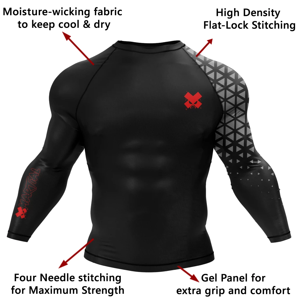 - Anti-slip gel panel technology for extra grip and keeping the rash guard from riding up.