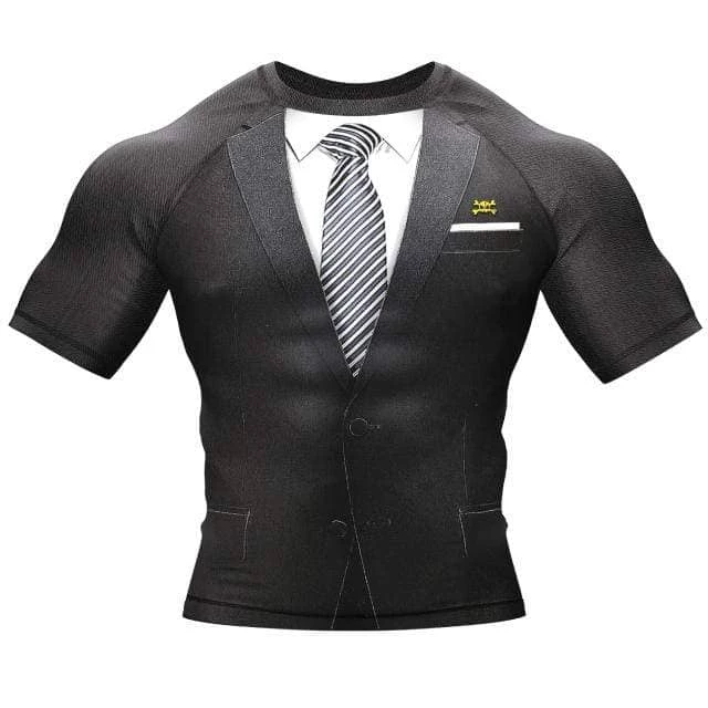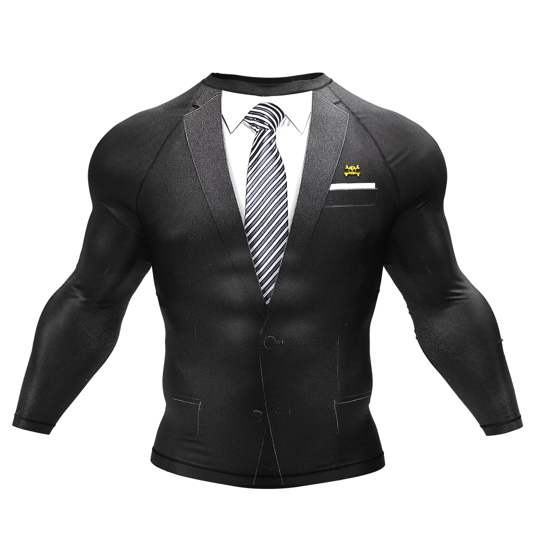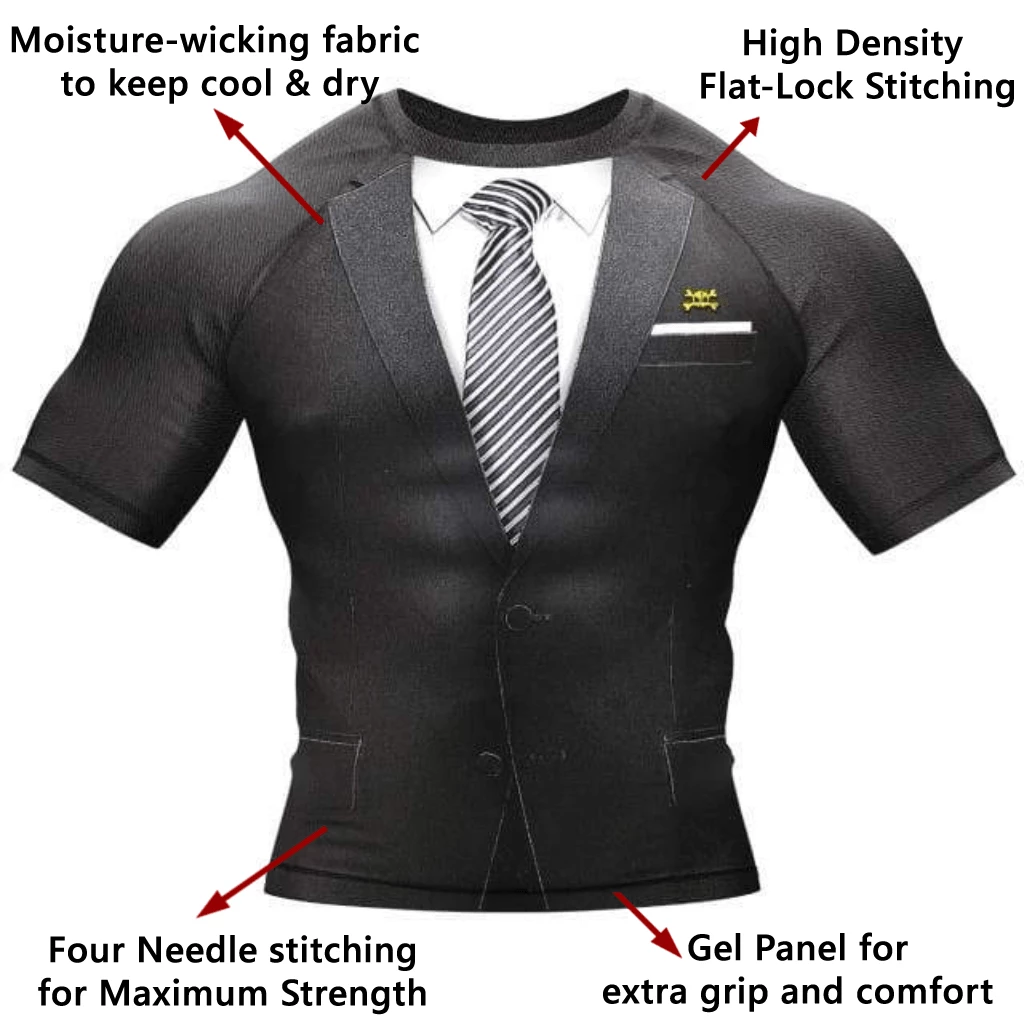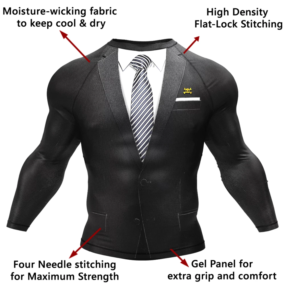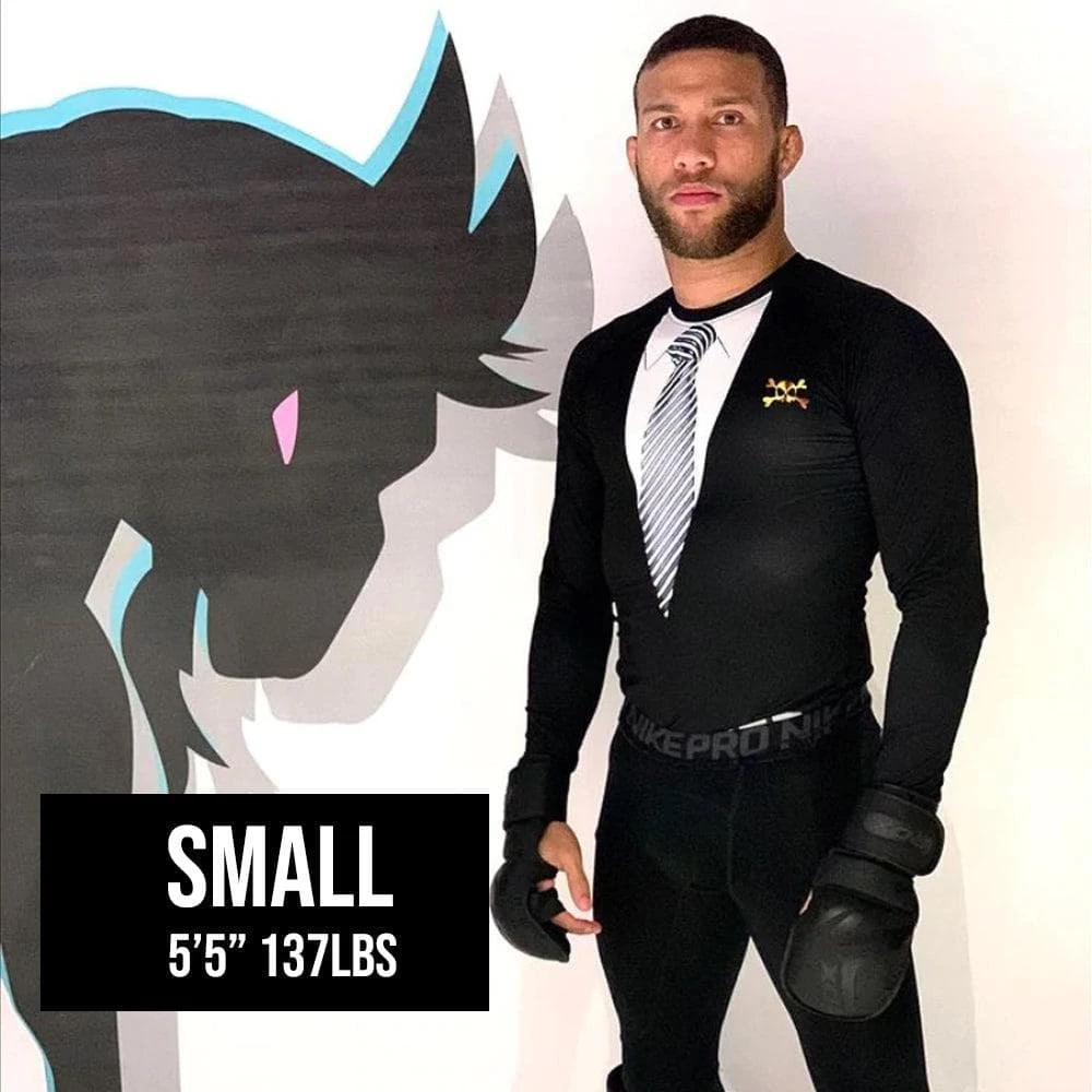 Change into Black Tuxedo Rash Guard before you welcome visitors to the mats! You will be at your best while taking care of the business in a sleek compression shirt designed for comfort and training. Both long and short sleeves are available. This rash guard is excellent for more than just jiu-jitsu! It’s great for MMA and BJJ, and also for surfing and watersports, and men’s fitness.