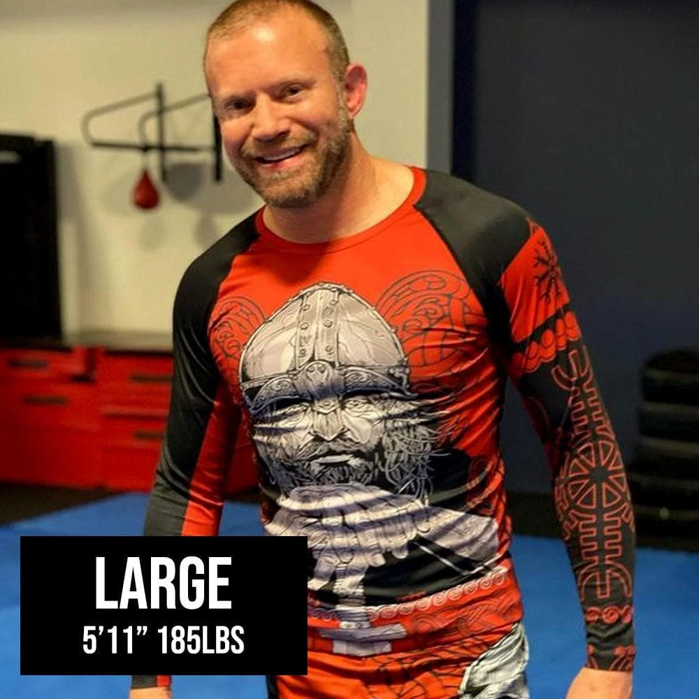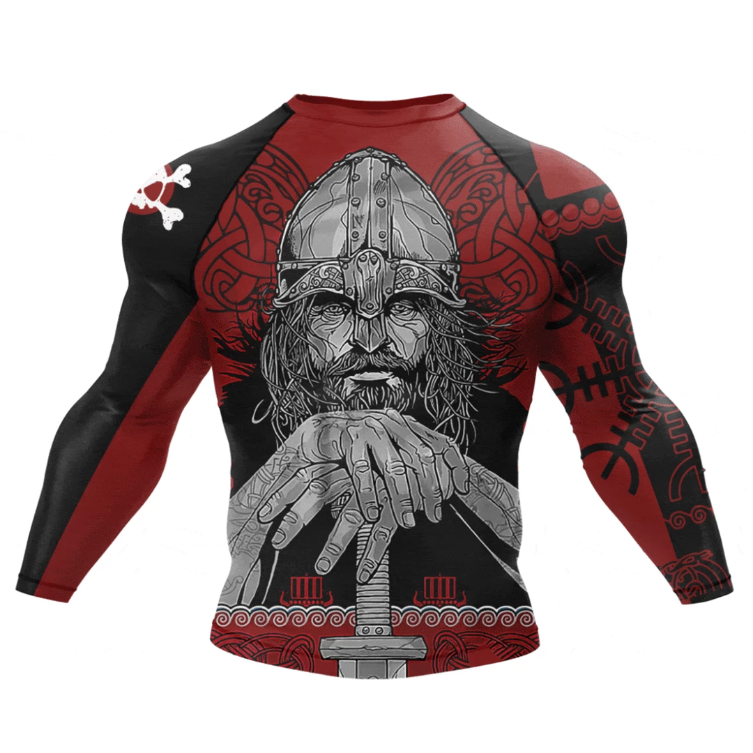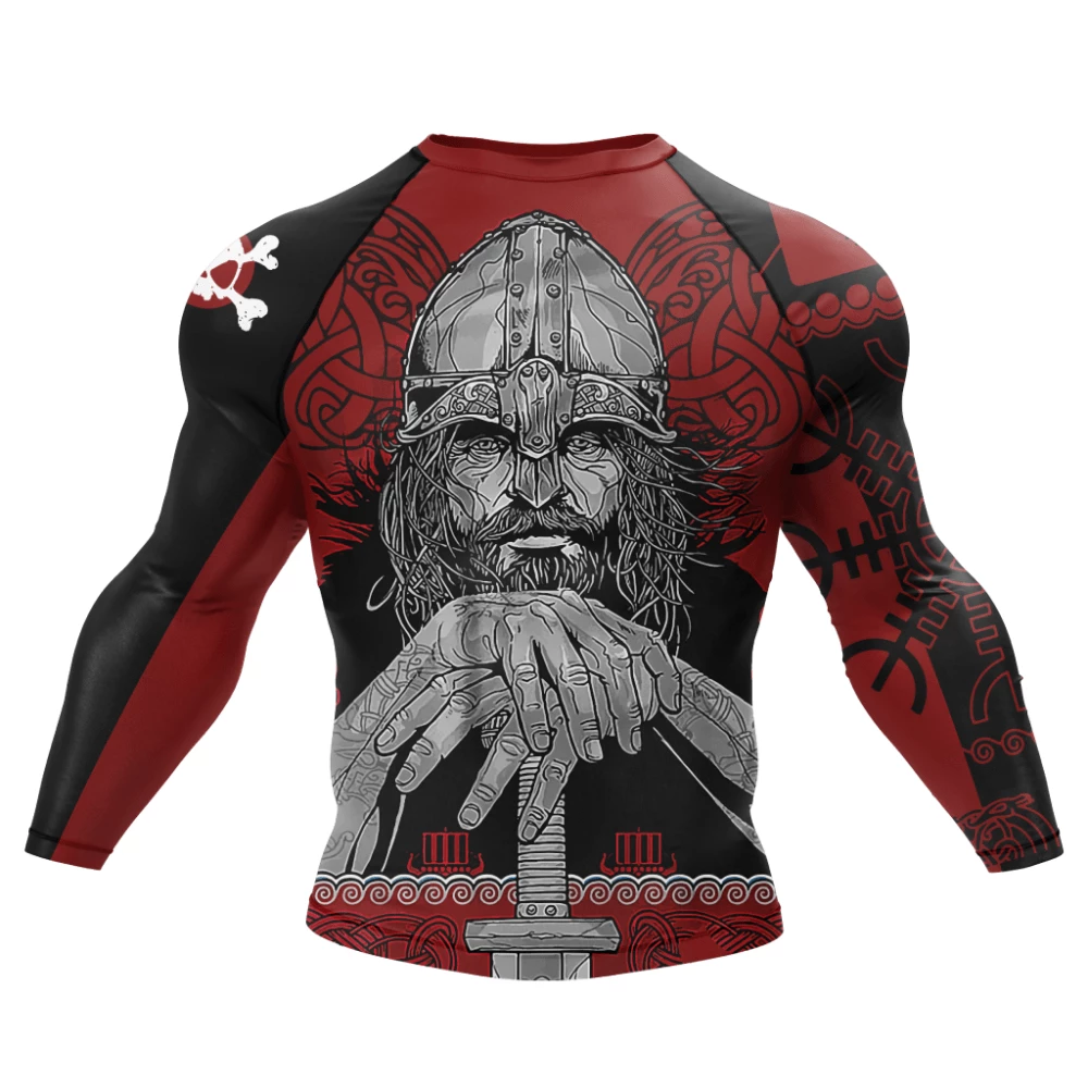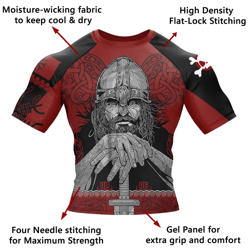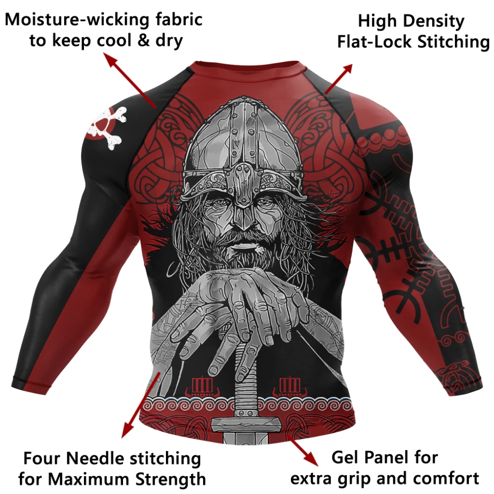The Red Viking Rash Guard is embossed with the image of a wise and daring Viking. This compression shirt is built to resist through every battle and provides the highest degree of flexibility, mobility, and protection. Long and short sleeves are both available. It’s not only about jiu-jitsu anymore! Great for MMA and BJJ rash guards, surfing, watersports, and men’s training.