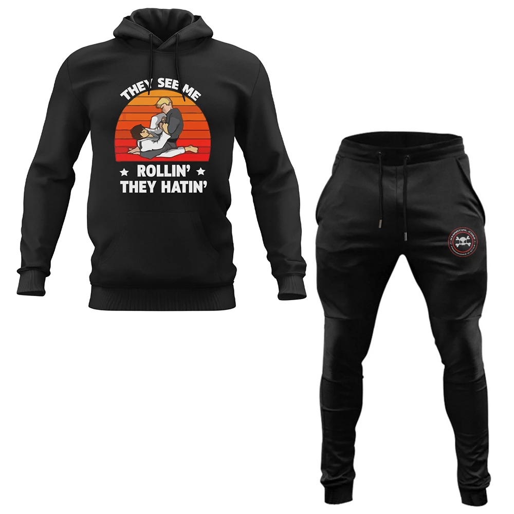 The Rollin’ They Hatin’ BJJ Hoodie features an athletic fit with a long line curved hem and a kangaroo pouch pocket that makes it functional for everyday use as well as a comfortable and stylish training option. The Rollin’ They Hatin’ BJJ Joggers offer a slick street look with style and comfort. Both feature logos across the chest and thigh. Available as a set.