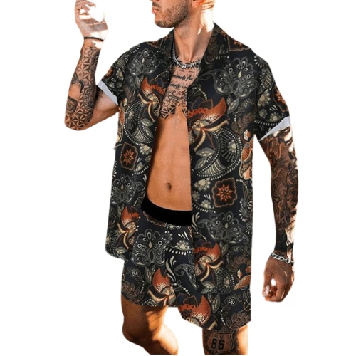- The two-piece set for men consists of a short-sleeved shirt and shorts.