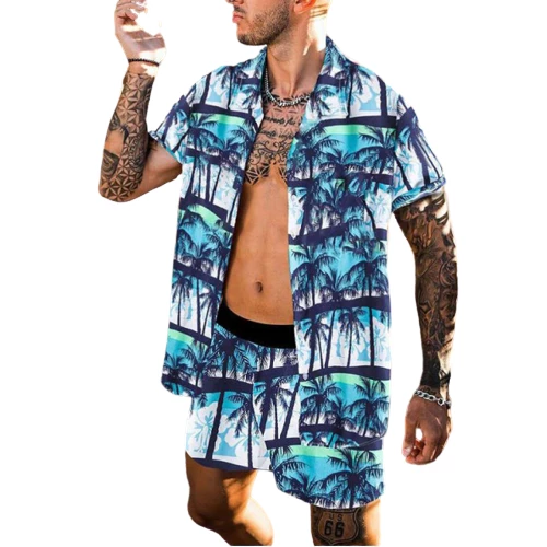 - The two-piece set for men consists of a short-sleeved shirt and shorts.