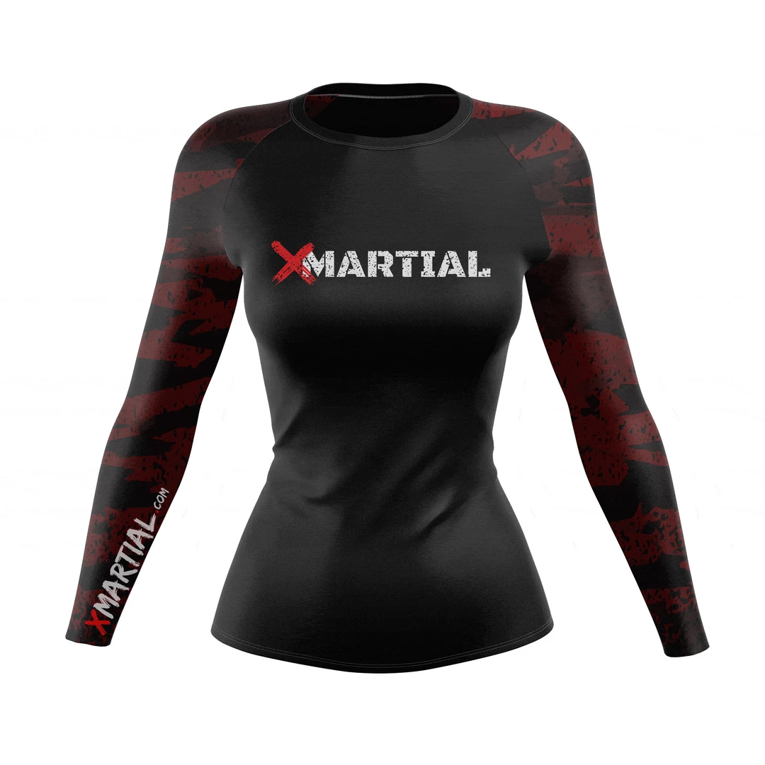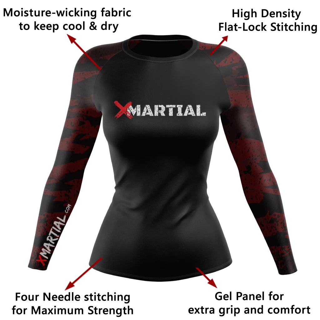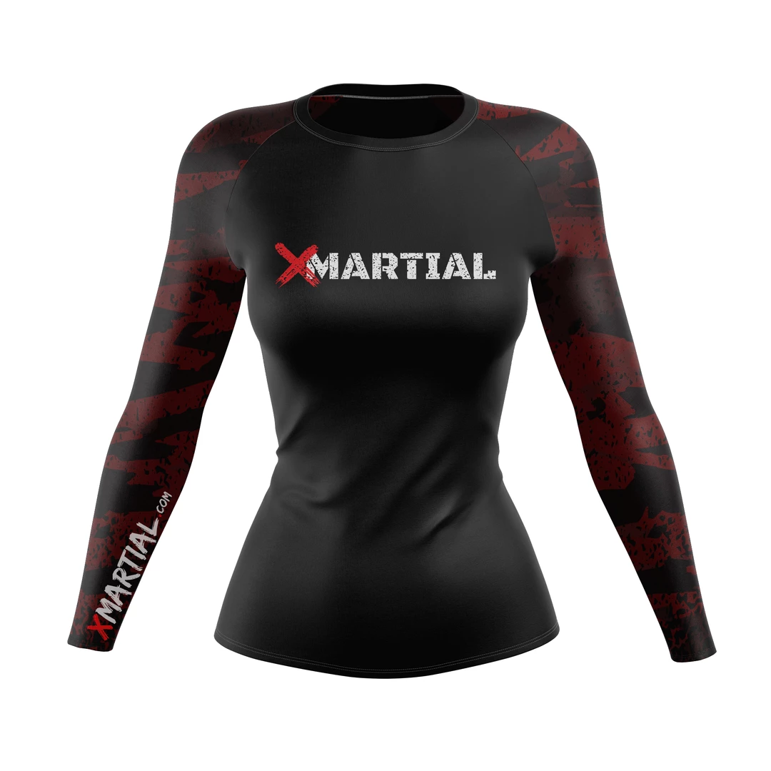 The XMartial Women’s Rash Guard bears the XMartial logo, which represents danger and strength. Wear a compression shirt designed for rigorous training and workouts to represent the skill of an XMartial athlete. Long and short sleeves are both available. This isn’t just for jiu-jitsu. Great for MMA and BJJ rash guards, surfing, watersports, and as a women’s workout compression shirt.