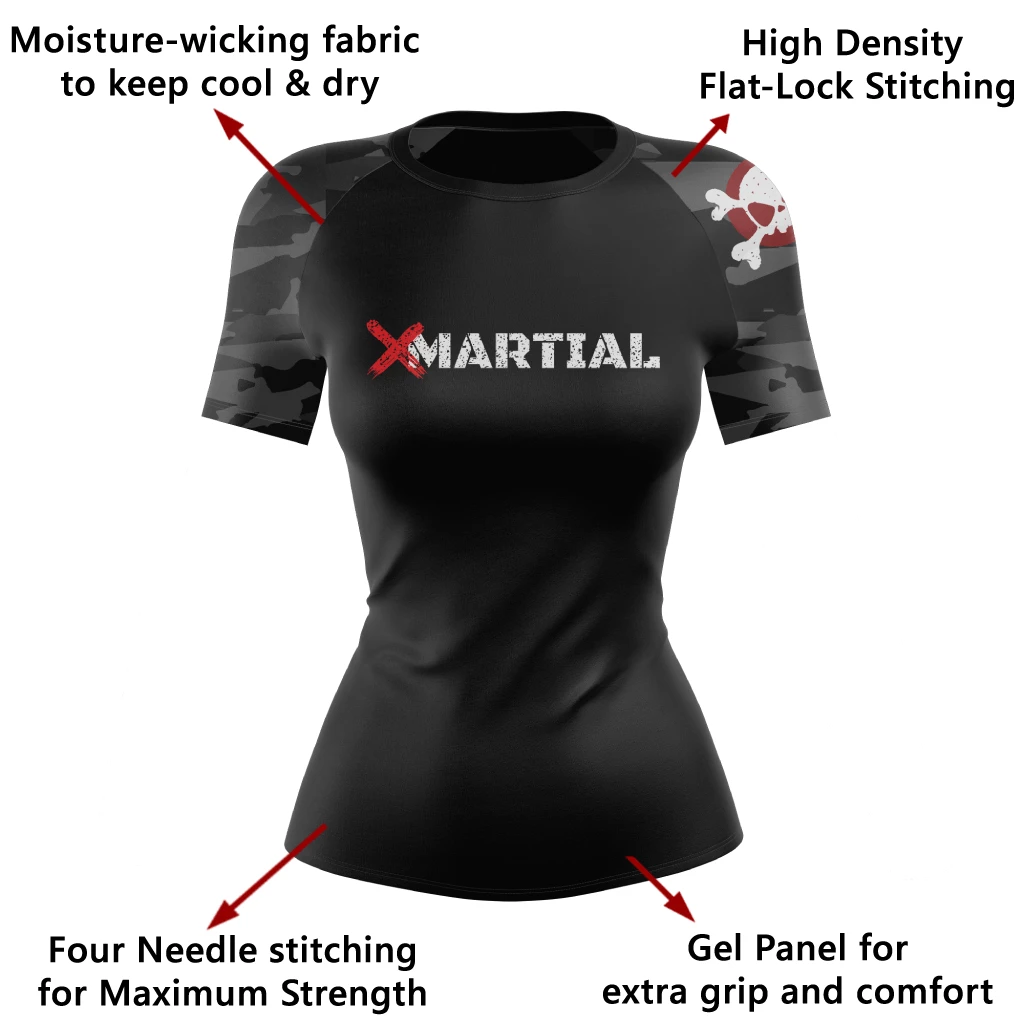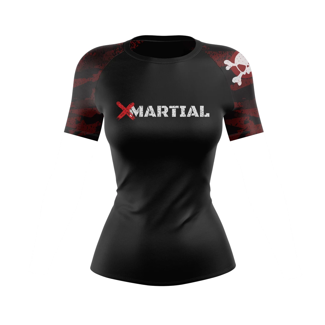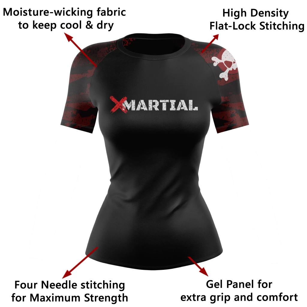 The XMartial Women’s Rash Guard bears the XMartial logo, which represents danger and strength. Wear a compression shirt designed for rigorous training and workouts to represent the skill of an XMartial athlete. Long and short sleeves are both available. This isn’t just for jiu-jitsu. Great for MMA and BJJ rash guards, surfing, watersports, and as a women’s workout compression shirt.